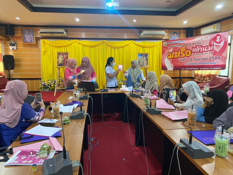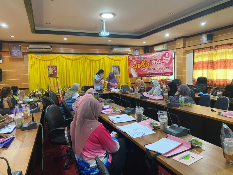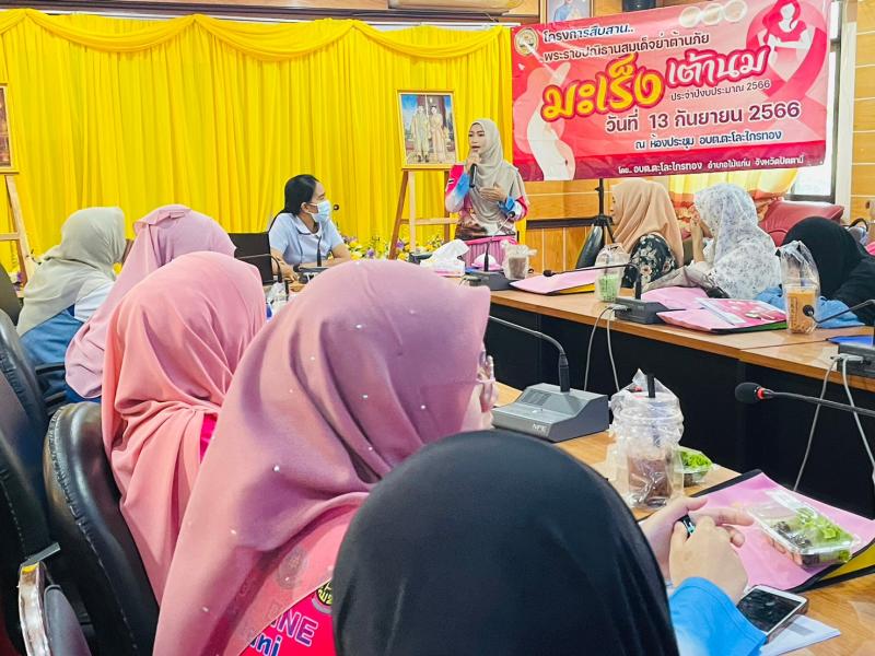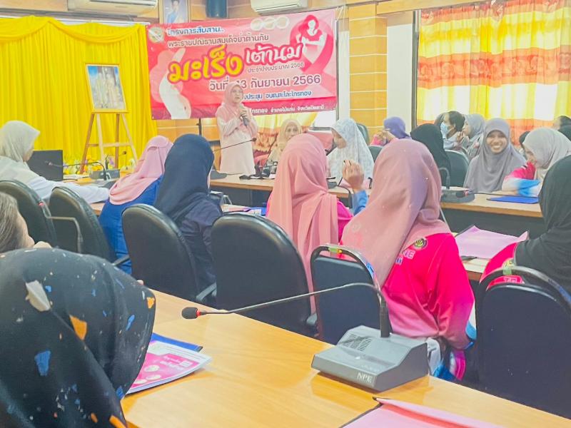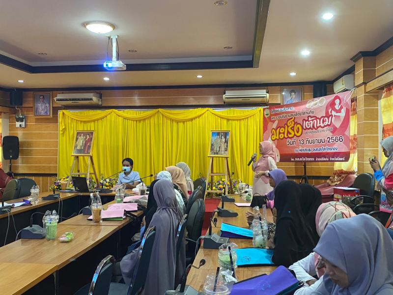 วันที่ 13 กันยายน 2566 เวลา 09.00 น. นายสมาน ยูโซะ นายกองค์การบริหารส่วนตำบลตะโละไกรทอง มอบหมายให้นางสาวนัสรินทร์ สาและ รองนายกองค์การบริหารส่วนตำบลตะโละไกรทอง พร้อมด้วยนางมาลี ศุกร์เพ็ง รองปลัดองค์การบริหารส่วนตำบล พบปะพูดคุยกับผู้เข้าร่วมโครงการสืบสานพระราชปณิธานสมเด็จย่าต้านภัยมะเร็งเต้านม ประจำปีงบประมาณ 2566 เพื่อส่งเสริมให้สตรีไทยในชนบท สามารถตรวจเต้านมด้วยตนเองได้อย่างถูกต้อง และพัฒนาระบบการคัดกรองมะเร็งเต้านมที่เริ่มด้วยการตรวจเต้านมด้วยตนเองอย่างมีประสิทธิภาพต่อไป ให้เป็นไปตามพระราชประสงค์ของสมเด็จย่า ที่ประสงค์ให้สตรีไทยปลอดภัยจากโรคมะเร็งเต้านม ณ ห้องประชุมองค์การบริหารส่วนตำบลตะโละไกรทอง อำเภอไม้แก่น จังหวัดปัตตานี