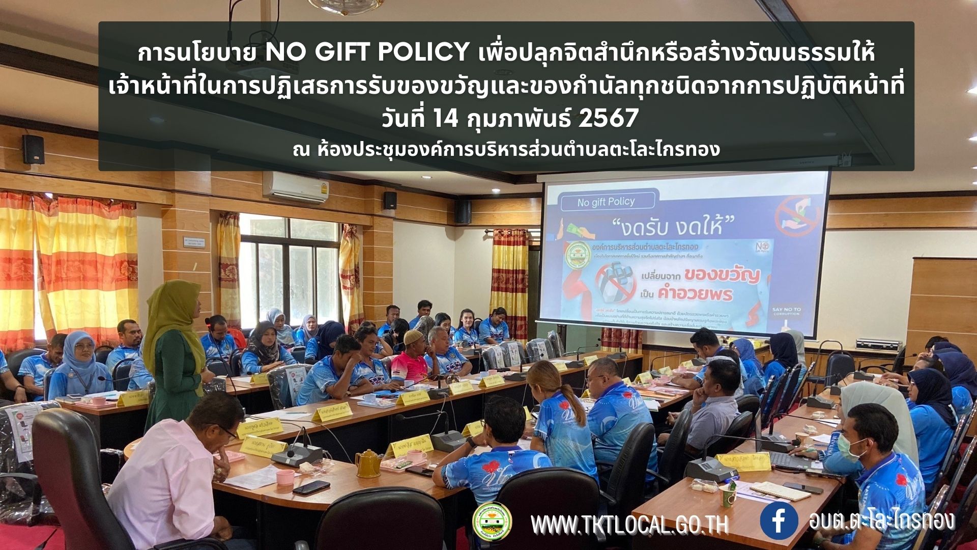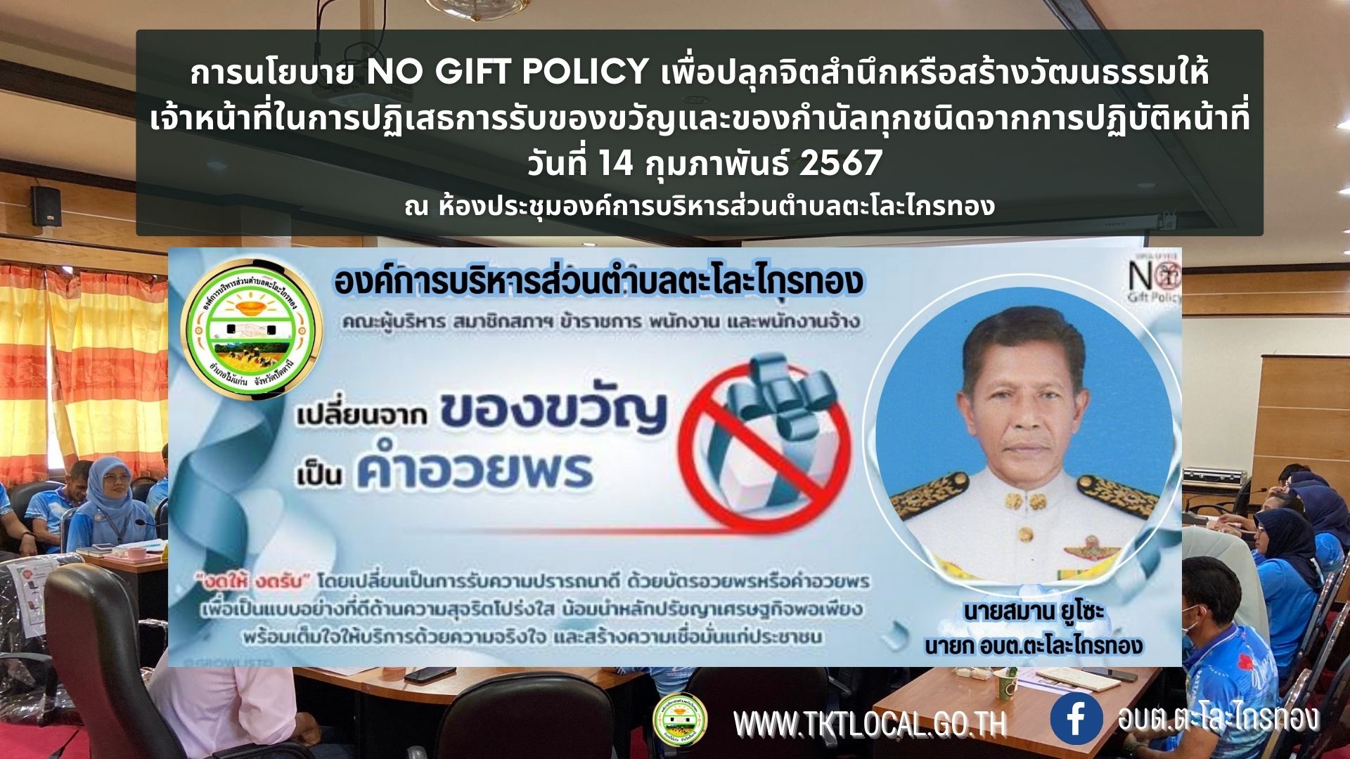 วันที่ 14 กุมภาพันธ์ 2567 เวลา 13.30 น. นายสมาน ยูโซะ นายกองค์การบริหารส่วนตำบลตะโละไกรทอง เป็นประธานในการจัดกิจกรรมขับเคลื่อนนโยบายไม่รับของขวัญและของกำนัลทุกชนิดจากการปฏิบัติงาน (No Gift Policy) ตามที่ได้มีการประกาศเจตนารมณ์ "สุจริต โปร่งใส องค์การบริหารส่วนตำบลตะโละไกรทอง" เพื่อให้สมาชิกสภาองค์การบริหารส่วนตำบลตะโละไกรทองและเจ้าหน้าที่ขององค์การบริหารส่วนตำบลตะโละไกรทอง ทั้งพนักงานส่วนตำบลแลพนักงานจ้างทุกระดับชั้นงดการรับและให้ของขวัญหรือผลประโยชน์อื่นใดในช่วงเทศกาลและในทุกโอกาส