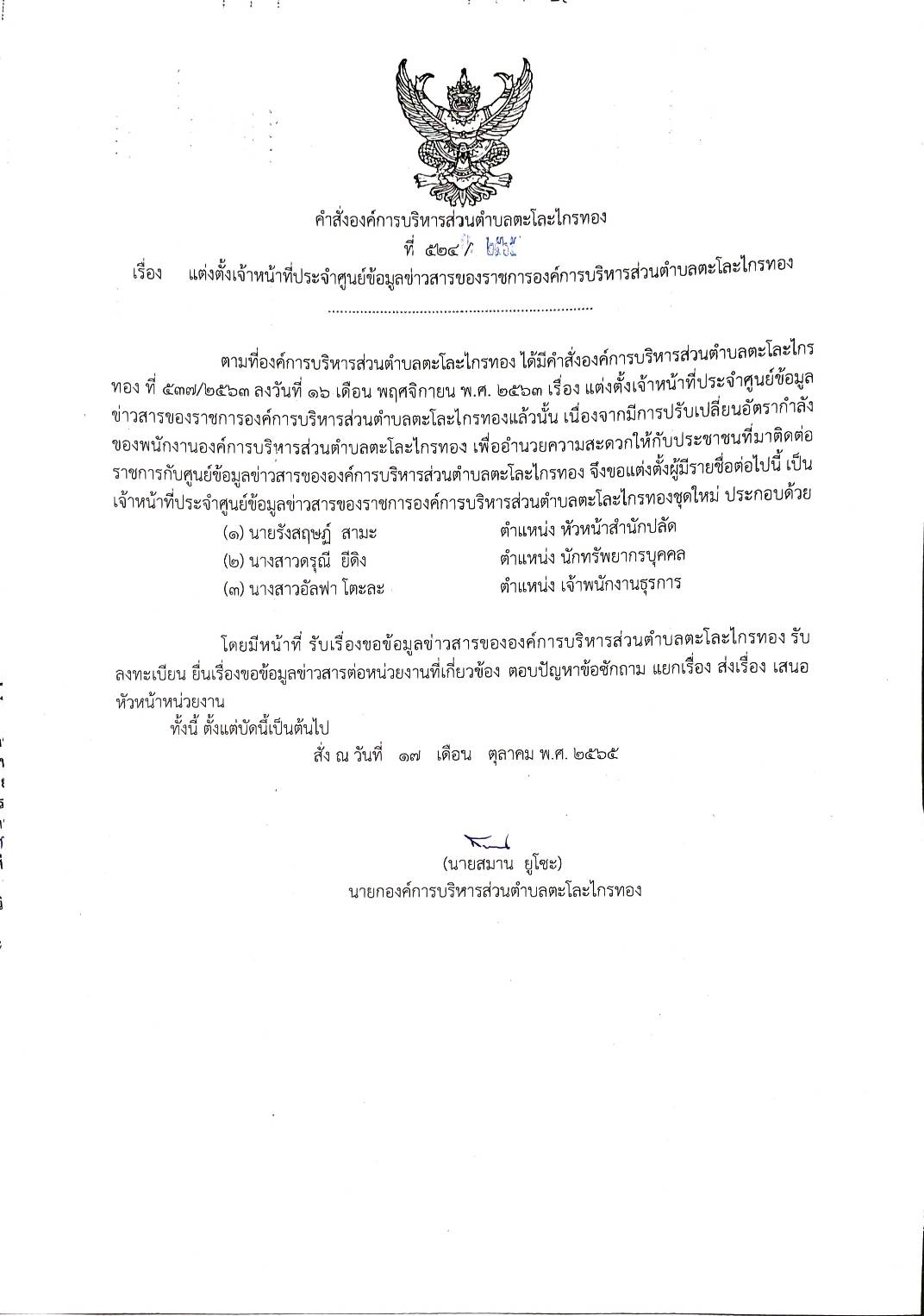คำสั่งแต่งตั้งเจ้าหน้าที่ประจำศูนย์ข้อมูลข่าวสารของราชการองค์การบริหารส่วนตำบลตะโละไกรทอง